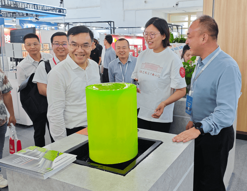 姜萬榮副部長參觀澎內(nèi)傳展臺,邊聽講解、邊認(rèn)真觀看水池池壁裂縫自愈合實(shí)際應(yīng)用效果。