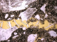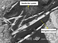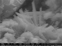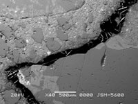 一旦反應(yīng)被激活可以沿著混 凝土的裂縫看到粗糙長晶體 和細(xì)小針狀晶體的生成。晶 體完全封堵住裂縫,降低混 凝土滲透性,提供防水保護(hù) | BEI拍攝的與上圖相同 裂縫表明澎內(nèi)傳系統(tǒng) 生成晶體正在密封該裂縫 | 放大的圖片清楚地顯示 裂縫中的粗糙長晶體 和細(xì)小針狀晶體 | 放大10,000倍后可以看到 這些晶體是怎么形成的 |